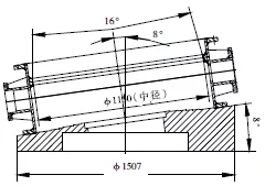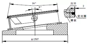 蝶板組合件起密封作用的零件是密封圈,密封圈為斜錐結(jié)構(gòu),其錐頂角為16°,厚度為13.5mm,由5層石棉板及4層不銹鋼板復(fù)合而成(圖6)。密封圈必須與蝶板和壓環(huán)等組裝在一起,加工時(shí)才能防止密封圈夾層中的不銹鋼板及石棉板翹曲變形。根據(jù)其結(jié)構(gòu)特點(diǎn),對(duì)蝶板組合件密封圈采用以下加工方法:(1)先在2.5m立車(chē)上分別把蝶板和壓環(huán)上的各止口加工到圖紙要求尺寸,外圓不加工;(2)按圖紙要求對(duì)壓環(huán)鉆孔,蝶板鉆孔攻絲;(3)壓環(huán)、密封圈和蝶板按圖紙裝配,將蝶板組合件工裝用螺栓緊固在閥體工裝上,然后再將蝶板組合件裝夾其上。立車(chē)刀桿旋轉(zhuǎn)8°車(chē)壓環(huán)、密封圈和蝶板至磨削尺寸;⑷用同樣厚度鋼板替下密封圈,車(chē)壓環(huán)、蝶板各錐面至圖紙尺寸;(5)工裝不動(dòng),將壓環(huán)、密封圈、蝶板重新按要求組裝,然后在立車(chē)刀架上裝磨頭,對(duì)密封圈進(jìn)行磨削處理,使其達(dá)到圖紙?jiān)O(shè)計(jì)粗糙度要求。