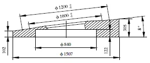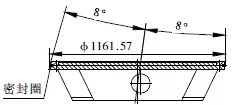 閥體起密封作為的為密封圈,焊接在閥體內(nèi)(圖5)。在2.5m立車(chē)上將組焊好的閥體裝夾在閥體密封圈加工工裝上,將立車(chē)刀桿旋轉(zhuǎn)8°,根據(jù)圖紙?jiān)O(shè)計(jì)要求,找正后沿圓錐母線方向走刀,車(chē)至未焊不銹鋼前的尺寸。然后堆焊不銹鋼,最后將焊好不銹鋼的閥體重新上立車(chē),按上述方法車(chē)閥體密封圈至圖紙要求尺寸。最后在立車(chē)刀架上裝磨頭,對(duì)閥體密封圈進(jìn)行磨削處理,使其達(dá)到圖紙?jiān)O(shè)計(jì)粗糙度要求。