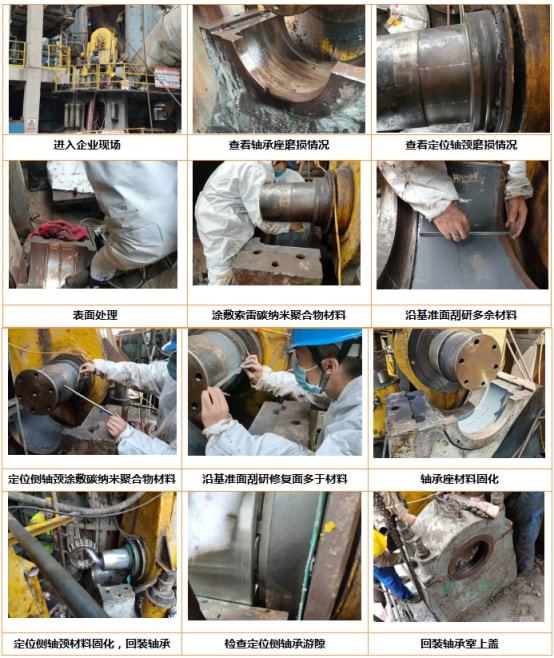 索雷碳納米聚合物材料修復(fù)工藝:根據(jù)不同磨損情況采用不同修復(fù)方案。在保證修復(fù)精度和滿足安裝要求的基礎(chǔ)上,避免軸承室表面熱應(yīng)力的出現(xiàn),且材料具有的金屬不具備的退讓性可以有效的緩解因設(shè)備振動(dòng)等造成的沖擊力,避免間隙出現(xiàn),使修復(fù)部位與軸承始終保持100%的面配合,延長(zhǎng)設(shè)備使用周期,且修復(fù)周期短。